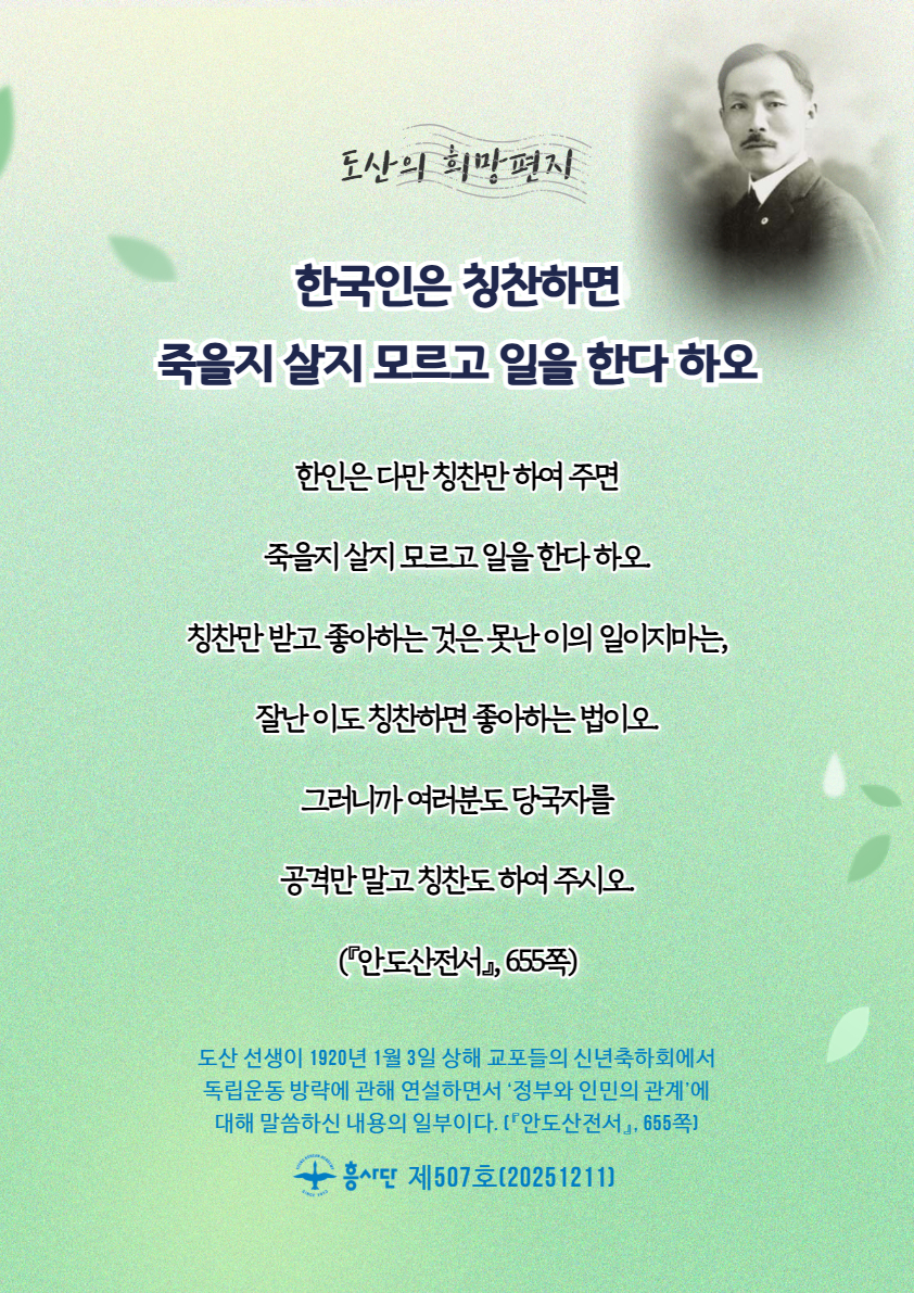 [도산의 희망편지] 한국인은 칭찬하면 죽을지 살지 모르고 일을 한다 하오
